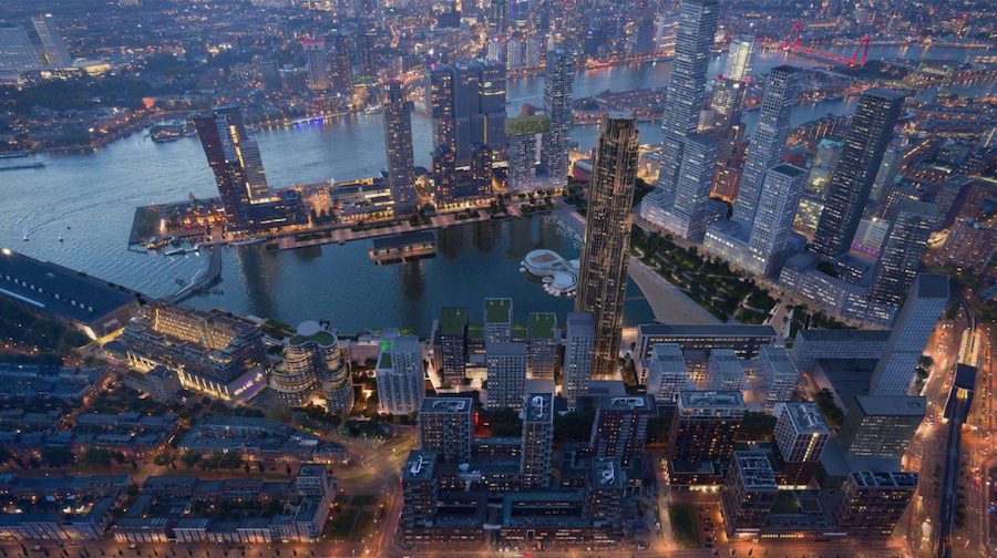 Transformation d’un ancien port de transbordement impliquant le drainage d’une partie du bassin portuaire de Rijnhaven pour recevoir un nouveau quartier.